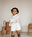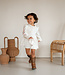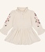 De Madee dress in een prachtige almond velvet met een borduursel van bloemen. Elk detail is zo mooi!